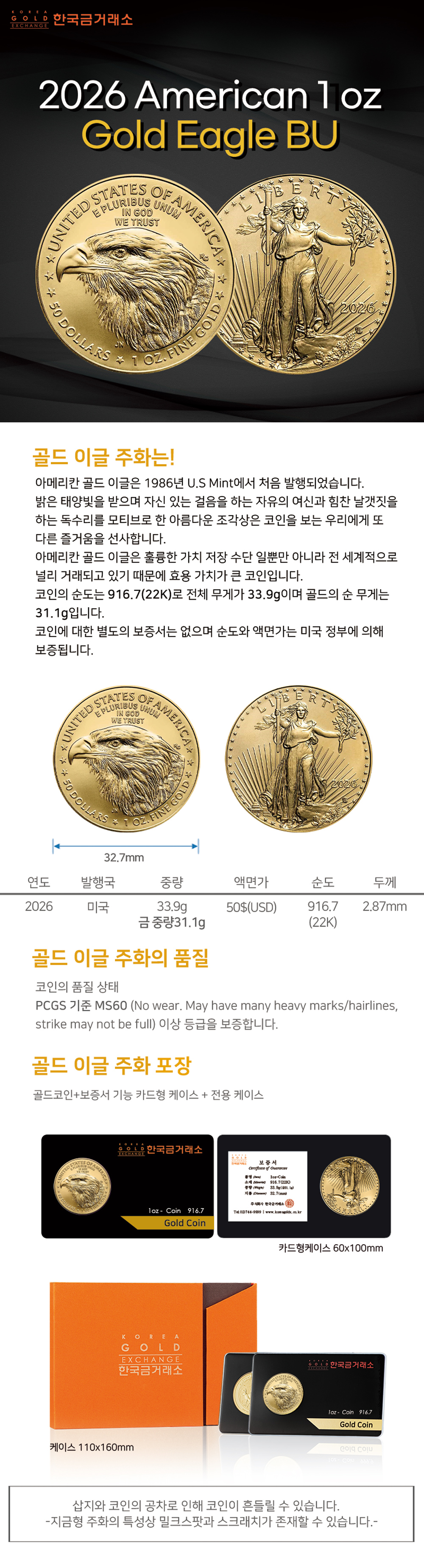 2026 1온스 아메리칸 골드 이글 불리온 주화(Coin) 50$(USD) - 22k